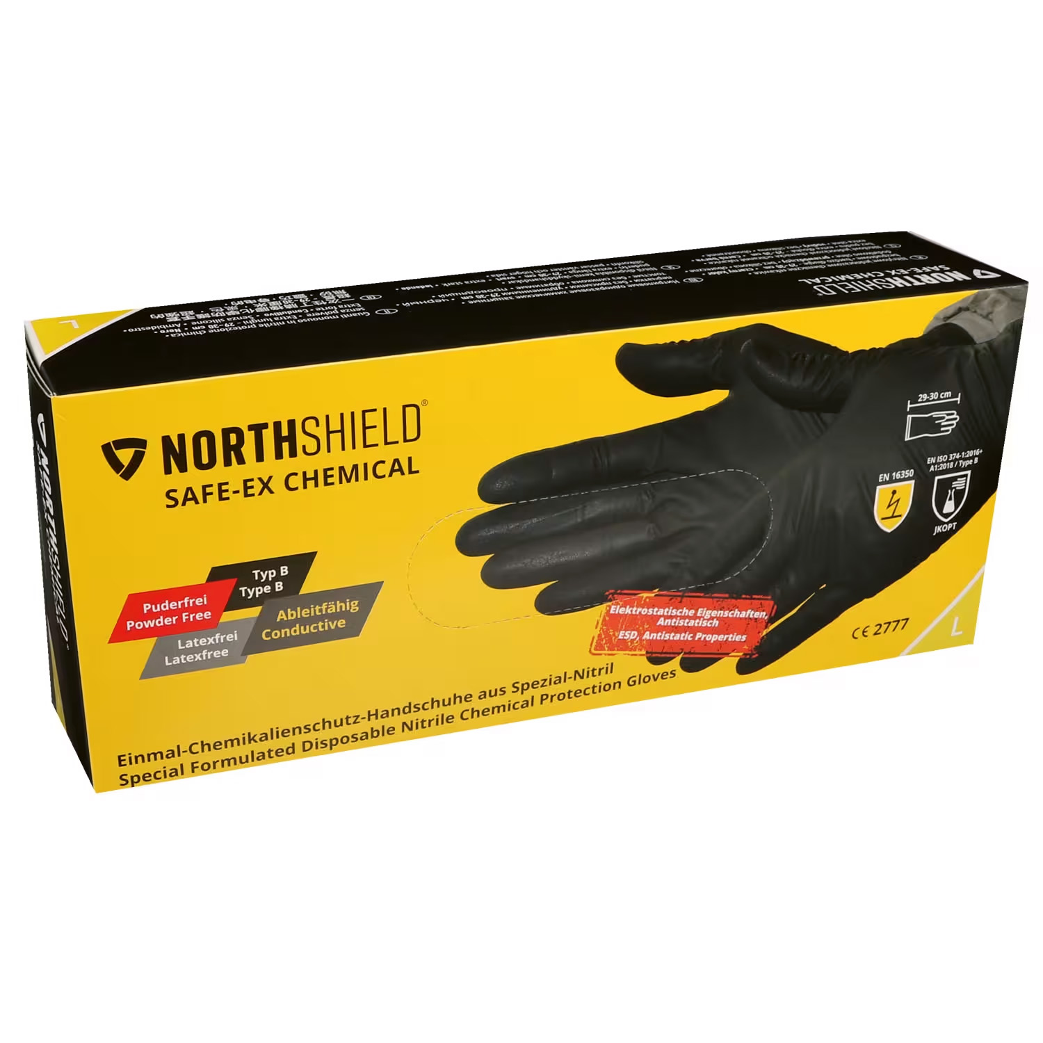 Die SAFE-EX CHEMICAL Handschuhe aus Nitril sind sehr strapazierfähig, chemikalienbeständig und ableitfähig. Diese Handschuhe erfüllen die Anforderungen für elektrostatisch ableitfähige Handschuhe gemäß EN16350 und sind eingestuft als Schutzausrüstung PSA der Kategorie III TYP B (5 definierte Prüfchemikalien gemäß Prüfliste).