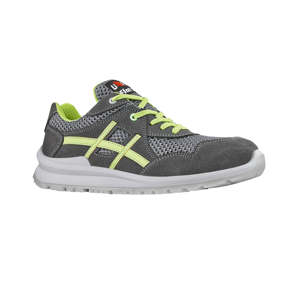 Sicherheitshalbschuh mit Obermaterial aus weichem Veloursleder mit extrem atmungsaktiven Mesh-Einsätzen.