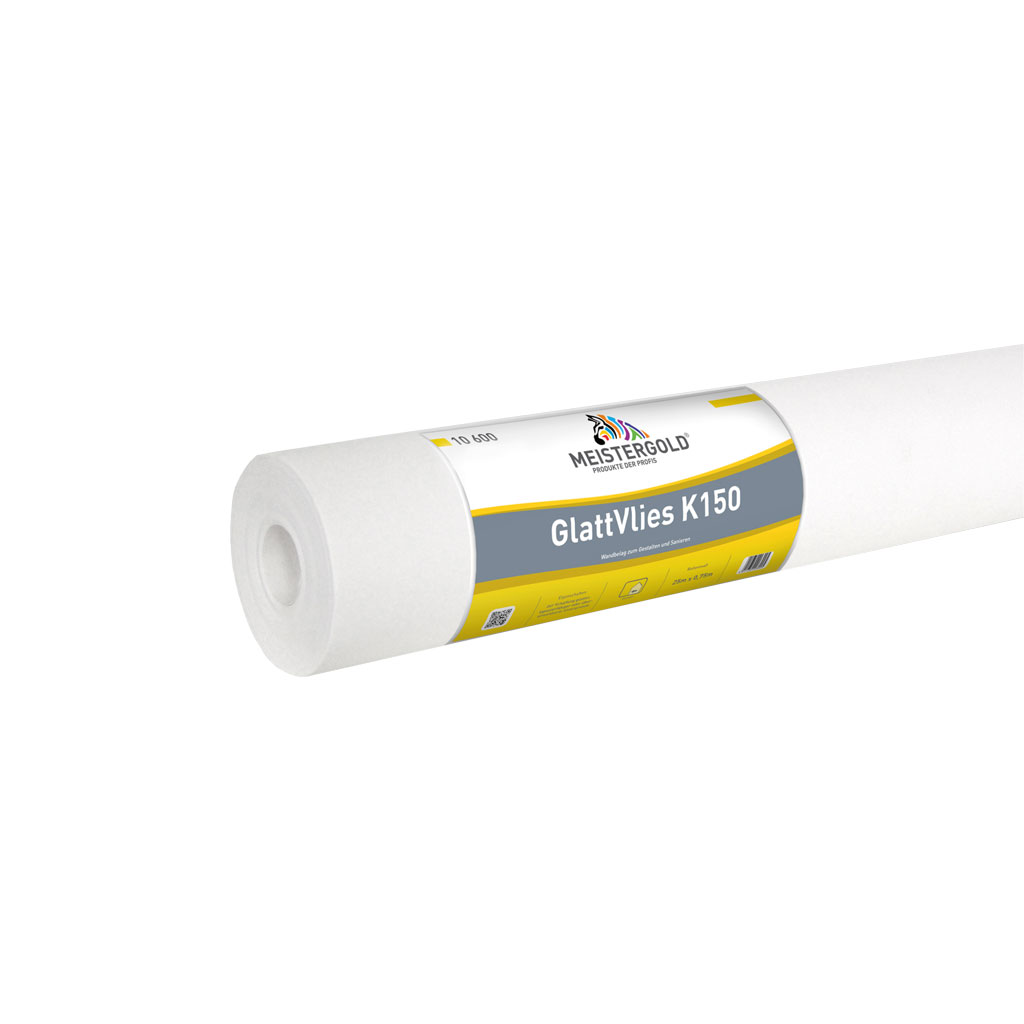 MEISTERGOLD Glattvlies K150 zur Gestaltung glatter, tapezierfähiger, oder überstreichbarer Untergründe. Wird in der Flächensanierung eingesetzt für strukturierte Untergründe z.B. Glasgewebe, Strukturputze, oder zur Überbrückung von Haar- und Schrumpfrissen.